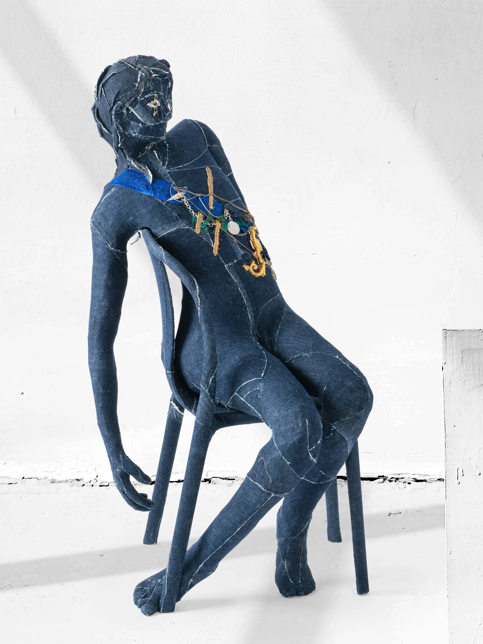 Drawing inspiration from the globally recognized game of ‘musical chairs’ and imbued with deeper symbolism related to scarcity, inclusion, and social dynamics, this remarkable denim sculpture is nestled within a slightly unbalanced denim-dressed Belleville chair. The sculpture transcends individual identities, resonating instead with collective human experiences and inviting viewers to reflect on the role each of us can play in creating a more inclusive world while respecting its natural resources.